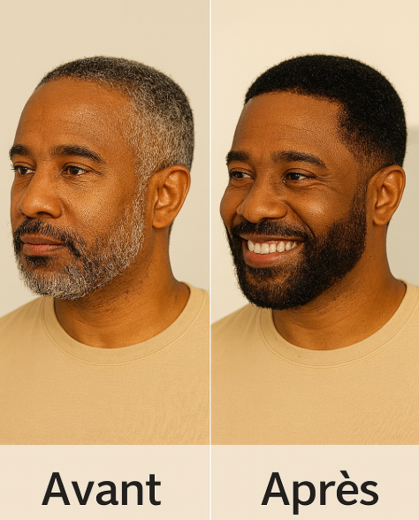 Le fini est naturel, mat et homogÚne, sans effet artificiel. Les cheveux gris sont subtilement camouflés, donnant une apparence plus jeune et uniforme. Personne ne remarquera la retouche : on verra seulement des cheveux soignés et vibrants.